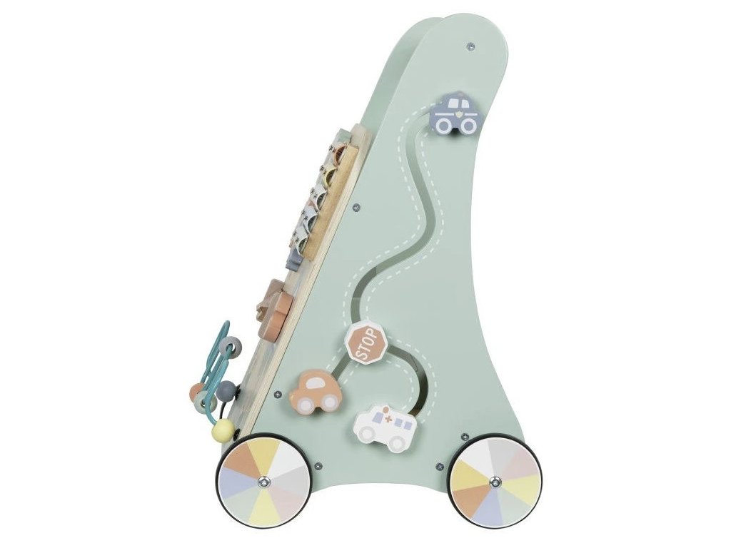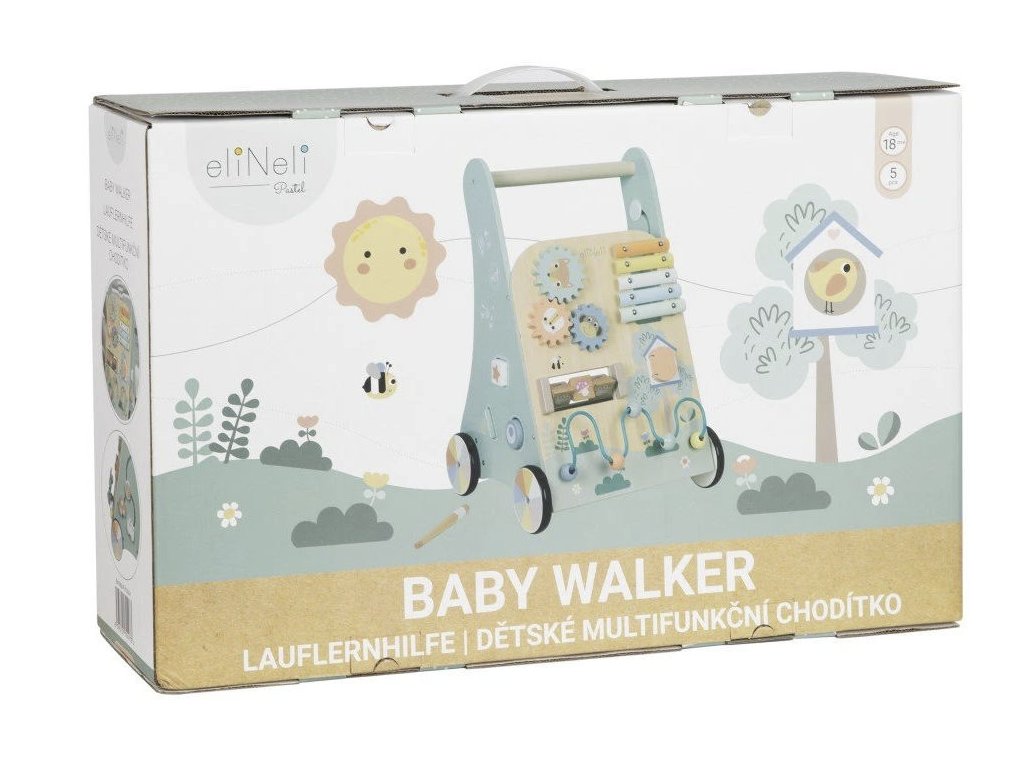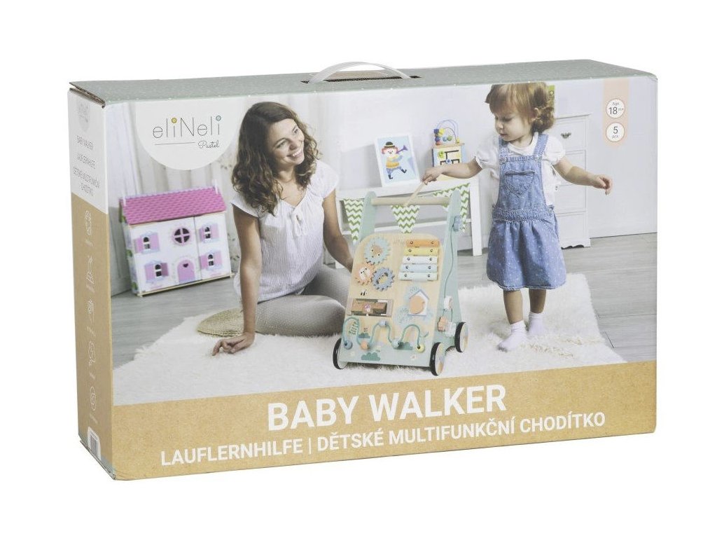Dřevěné chodítko pro děti v jemných pastelových barvách, se zvířátky a přírodními motivy, nadchne každé dítko. Chodítko pomůže dětem se samostatnou chůzí a s přesunem z dětského pokoje třeba do kuchyně za maminkou. Spolu s chodítkem nepřesunou děti jen sebe, ale rovnou i zábavnou hračkou se spoustou hracích prvků. Na jedené z bočních stran čeká na děti vkládačka se 3 vkládacími tvary, na druhé originální dráha se sanitkou a dalšími dřevěnými autíčky. S hracími prvky na přední straně potrénují děti jemnou motoriku, koordinaci očí a rukou, logické myšlení, kreativitu a ještě si zahrají na hudební nástroj v podobě xylofonu.