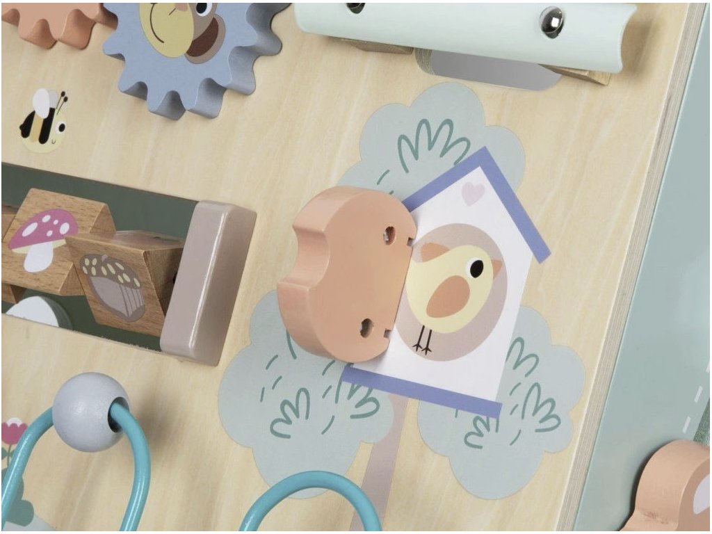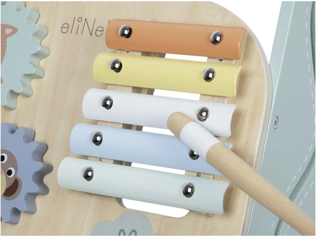 - Zábavné aktivity - vkládačka, dráha pro autíčka s autíčky, korálkové bludiště, 3 barevná ozubená kolečka se zvířátky, otáčecí kostky, otvírací dvířka, barevný xylofon s paličkou.