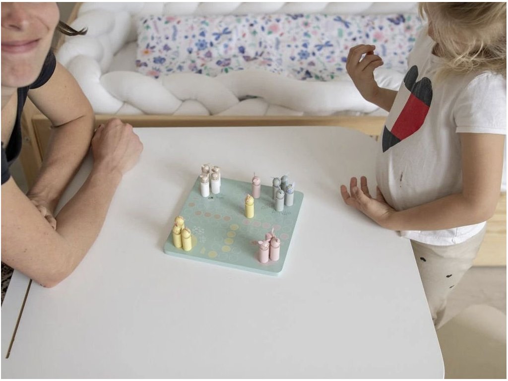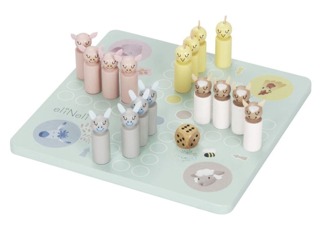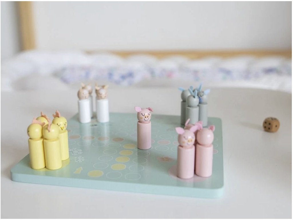 - Originální hrací figurky - při hře děti netáhnou s klasickými barevnými figurkami, ale se dřevěnými zvířátky z farmy - s prasátky, oslíky, ovečkami nebo slepičkami.