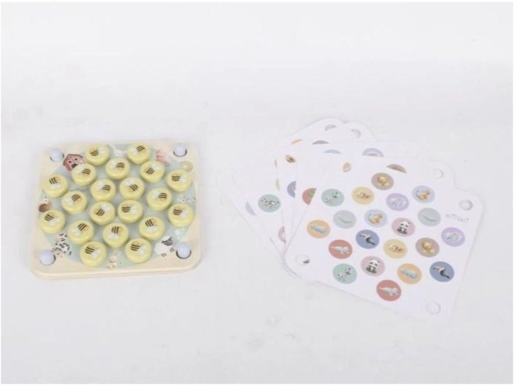 Dřevěné pexeso - Včeličky je vyrobeno z kvalitního dřeva, které zajišťuje dlouhou životnost a odolnost. Součástí hry je 5 podkladů (oboustranných karet) - jedna hra tedy může mít až 10 obměn.