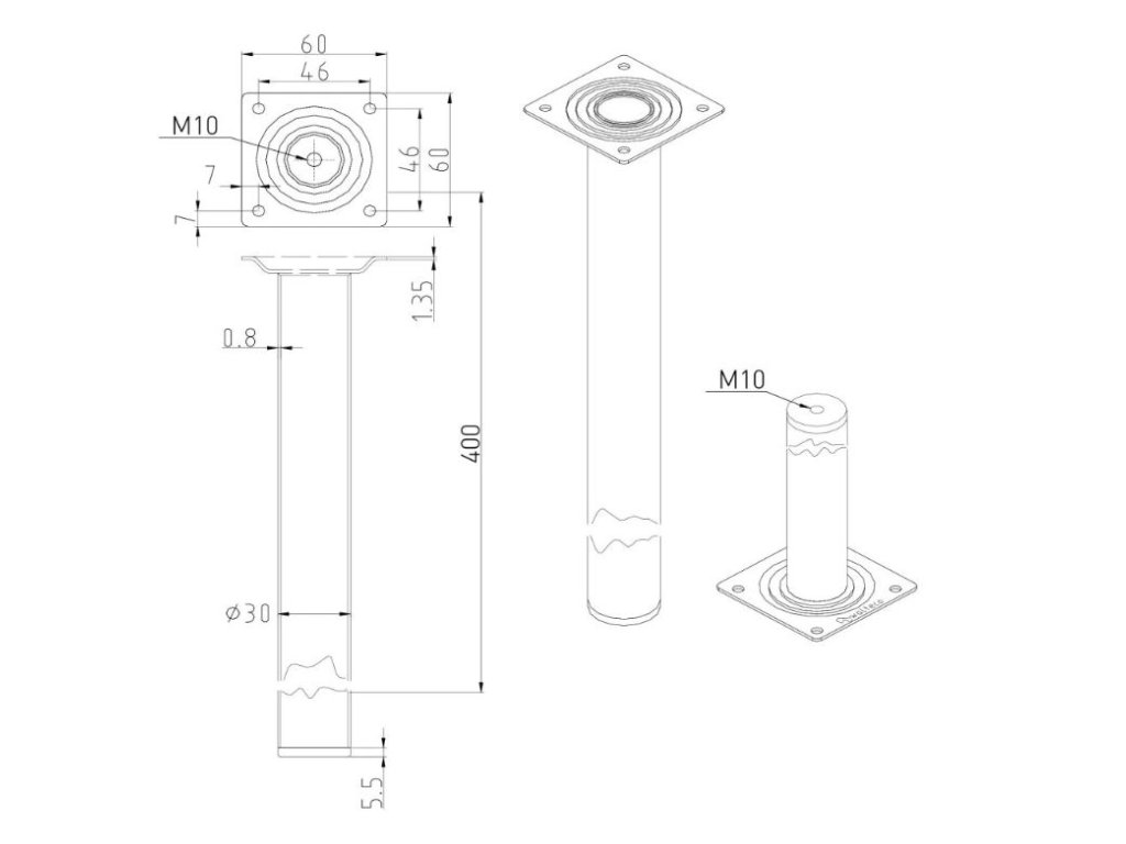 V případě nerovných povrchů nebo podlah doporučujeme přikoupit nastavitelný šroub se závitem M10.