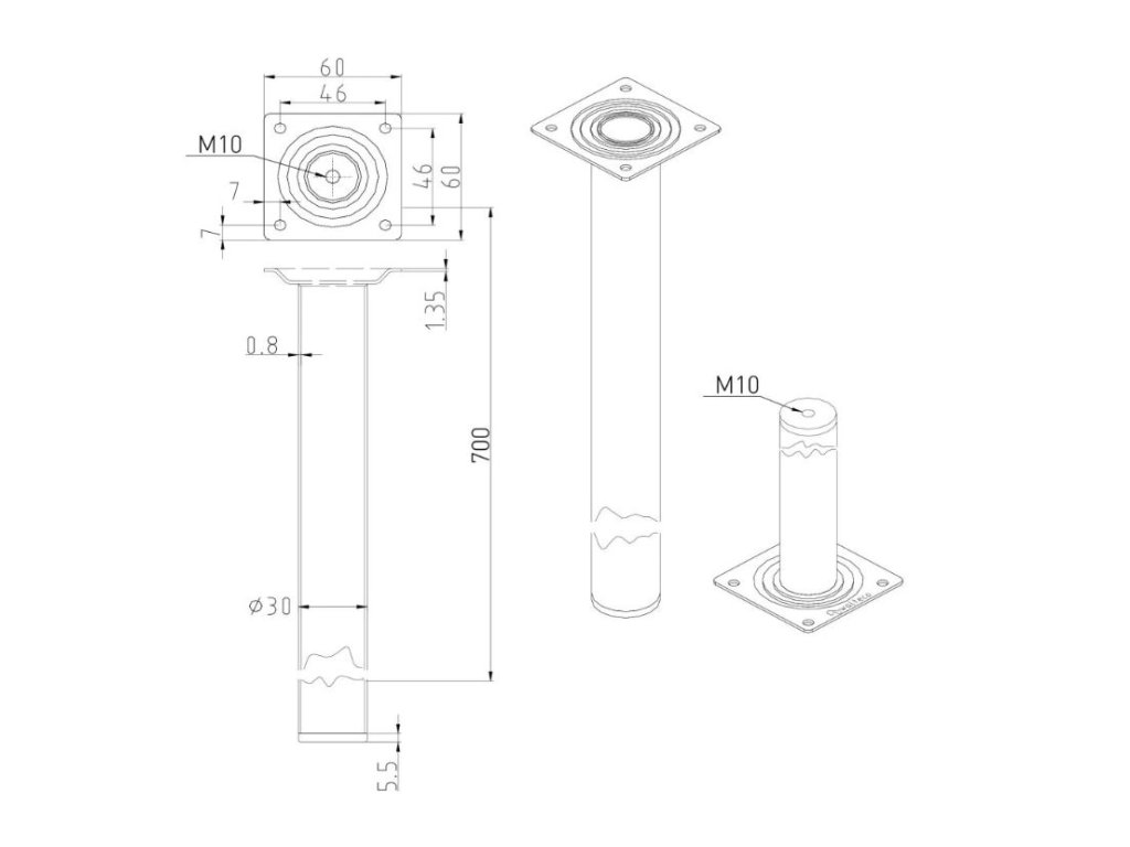 V případě nerovných povrchů nebo podlah doporučujeme přikoupit nastavitelný šroub se závitem M10.