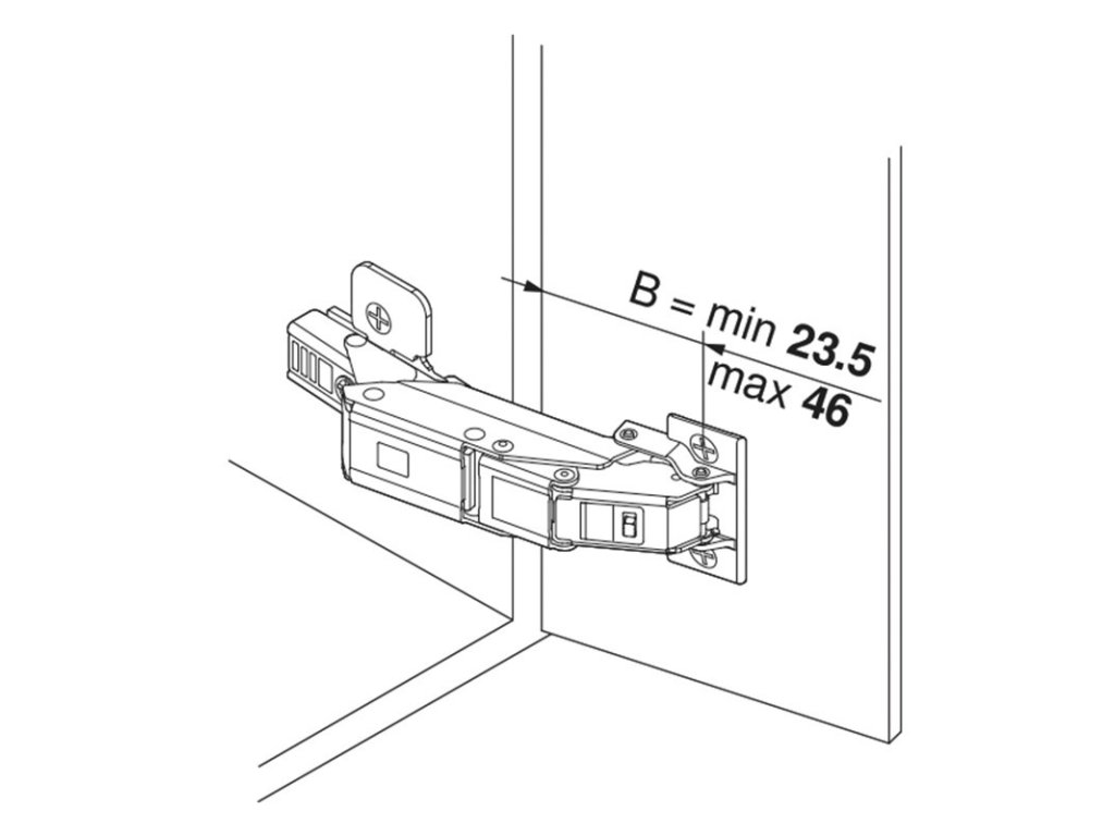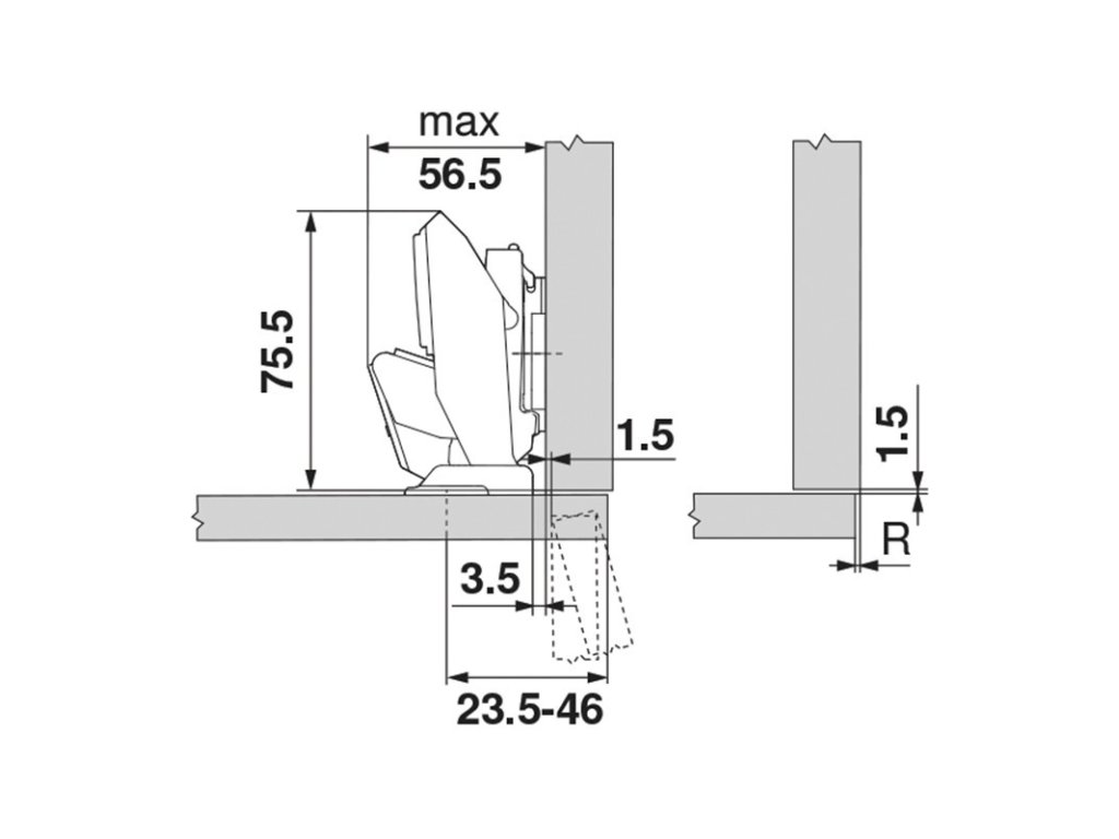 Závěs pro tenké materiály o síle 8-14mm s integrovaným BLUMOTION. Průměr frézovaných otvorů - 10mm. Hloubka - 6mmPoužitelné pro materiály: