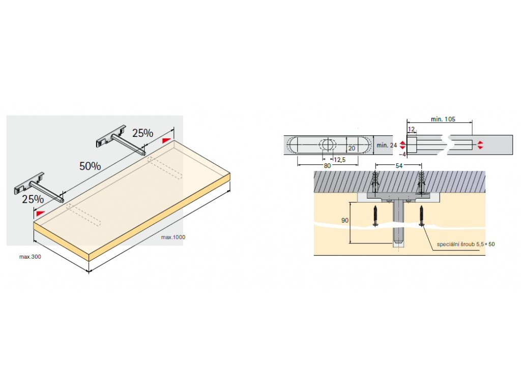 - neviditelný skrytý držák polic- maximální zatížení včetně police 9kg při použití dvou držáků