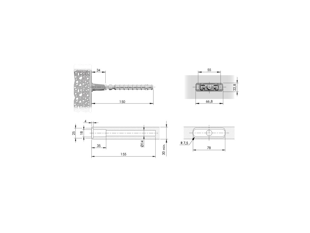 Montáž do stěny pomocí 2 hmoždinek pr.8 mm a 2 šrouby, rozteč vrtání 55 mm.