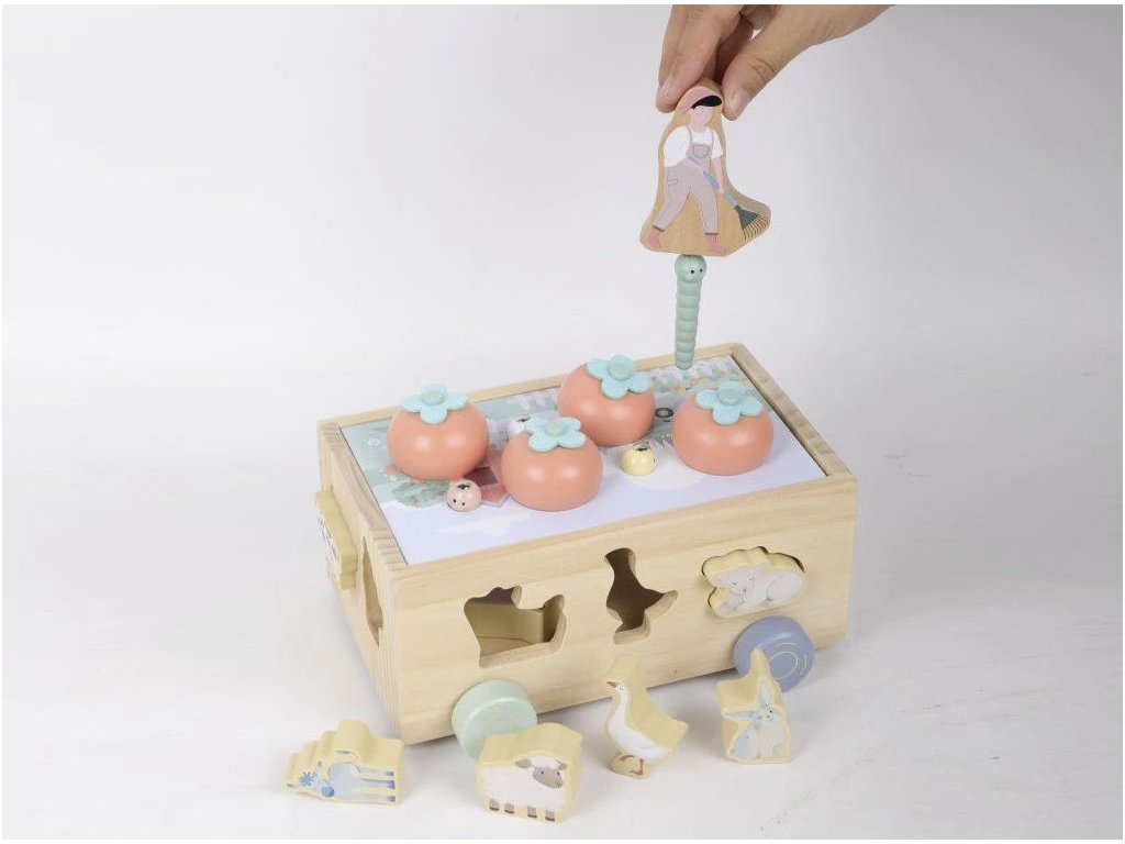 Netradiční zábavu si pro děti připravila originální, multifunkční, pojízdná farma. Tato hračka totiž obsahuje hned 2 vkládačky a magnetickou hru. Vkládačka na boční straně vozíčku má předchystané otvory pro vkládání zvířátek z farmy. Oblíbená zvířátka, která děti mohou vidět ve svém okolí, jsou vyobrazená v jejich skutečné, reálné podobě. Vrchní strana vozíčku představuje malou farmu, políčko, na které farmář pěstuje řepu. Stejně jako zvířátka i řepu mohou děti vkládat do otvorů. Na poli se však rozmnožili hladoví červíci, kteří si na úrodu brousí zoubky. Pomozte farmáři zachránit úrodu! Stačí jej vzít do ruky a pomocí magnetu na spodní straně panáčka červíky z pole vytahat. Při hře s touto multifunkční hračkou děti zdokonalují motorické dovednosti, koordinaci očí a rukou, učí se soustředit se a trpělivosti, poznávat barvičky a zvířátka, která mohou vidět ve svém okolí.