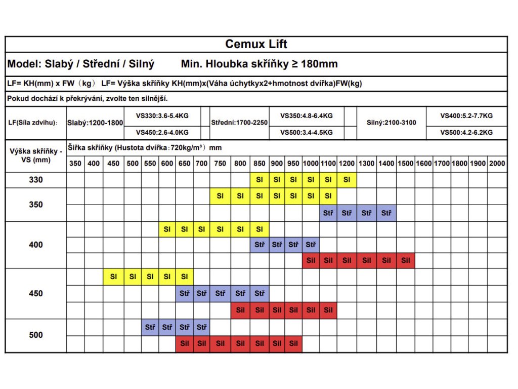 Tabulku pro přesné stanovení síly výklopu najdete na kartách jednotlivých zdvihačů.